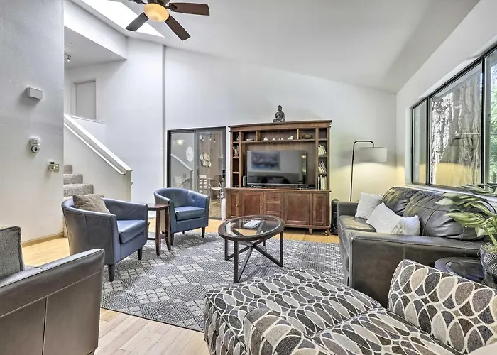 Positioned within a 10-minute drive of bustling shopping destinations such as Fife Creek Antiques and Collectibles, Tranquil Guerneville Home With Redwood Views offers guests to use parking.